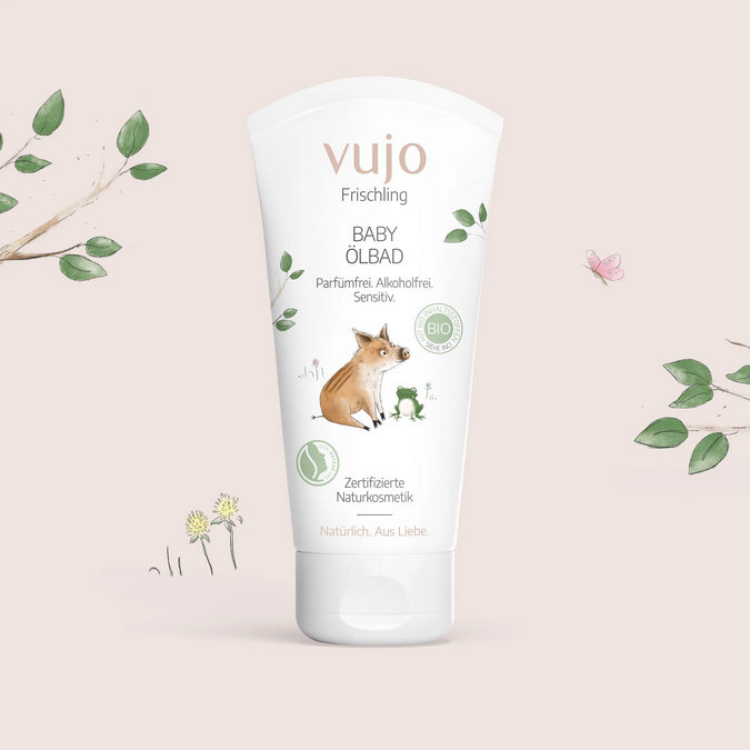 Das weiche vujo Frischling Baby Ölbad pflegt die Haut von Babys streichelzart schon beim ersten Baden, ohne zu schäumen. Erfahrungen haben gezeigt: Das Eincremen nach dem Baden mit dem vujo Frischling Ölbad ist in vielen Fällen nicht mehr notwendig. Die rückfettenden Eigenschaften der beinhalteten Bio-Öle (Sonnenblumen- und Reiskeimöl) stärken die Hautbarriere und unterstützen so den Feuchtigkeitshaushalt der empfindlichen Babyhaut langanhaltend.