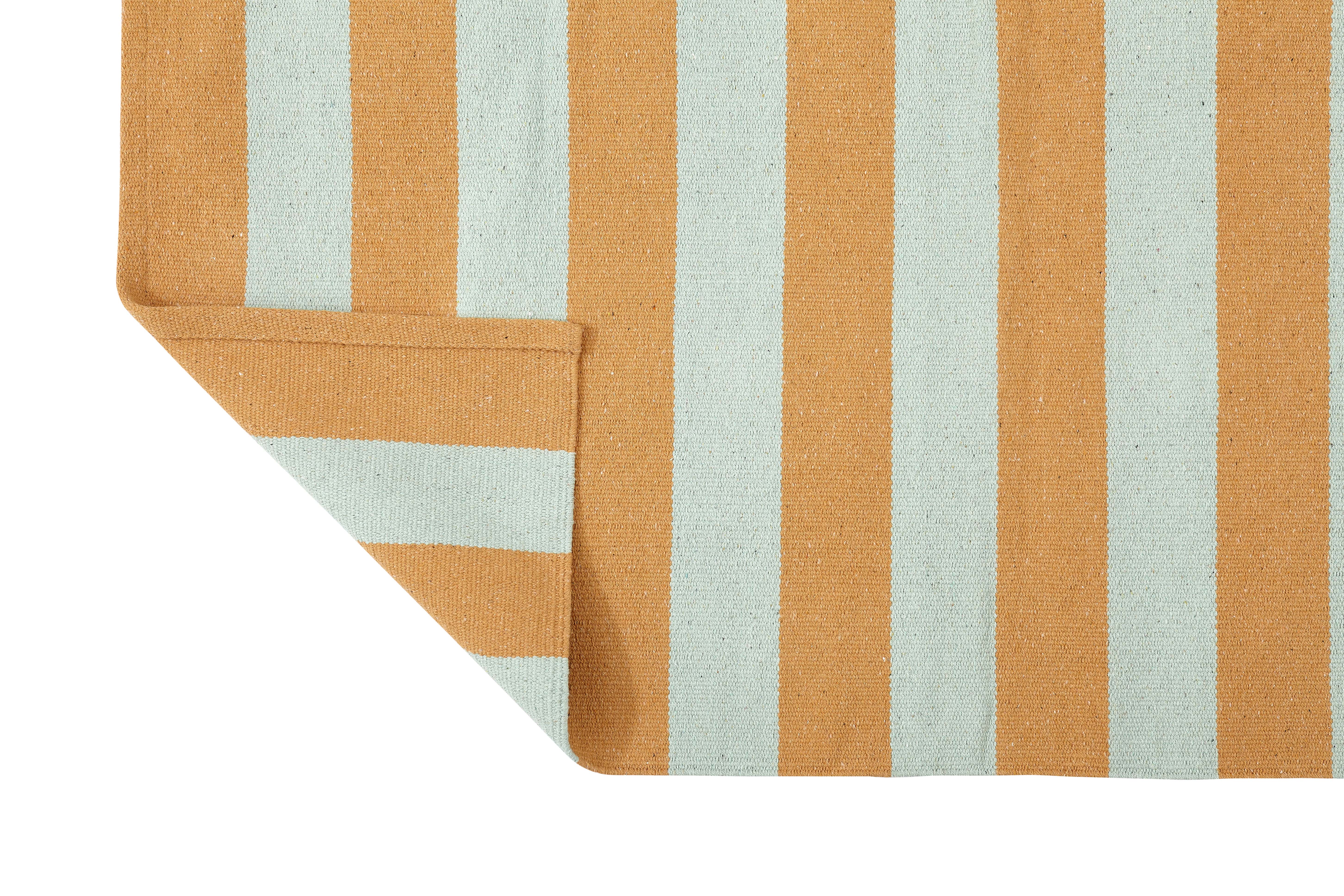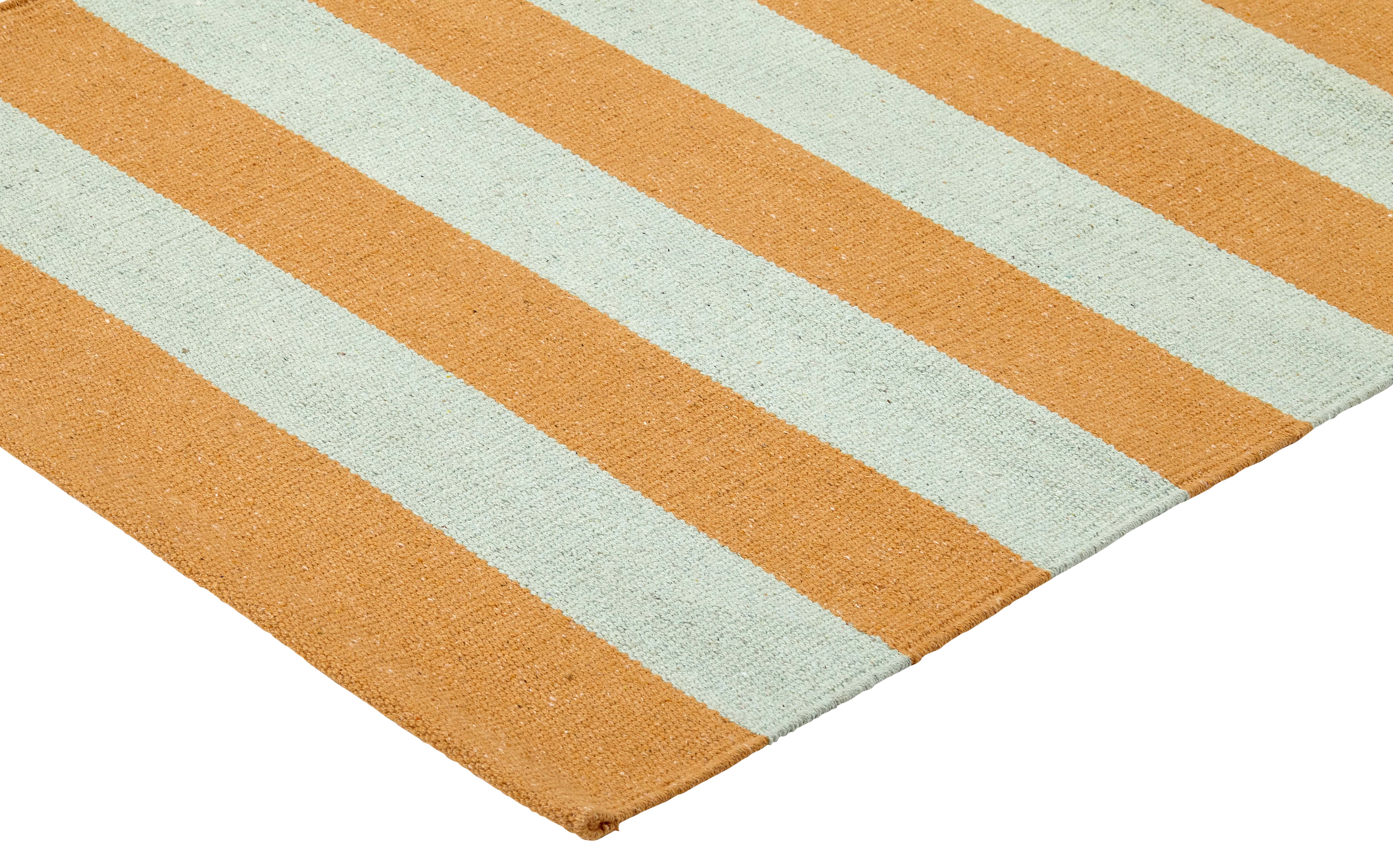 Der Teppich in klassischem Streifenmuster in Mint und Coral macht einfach gute Laune.