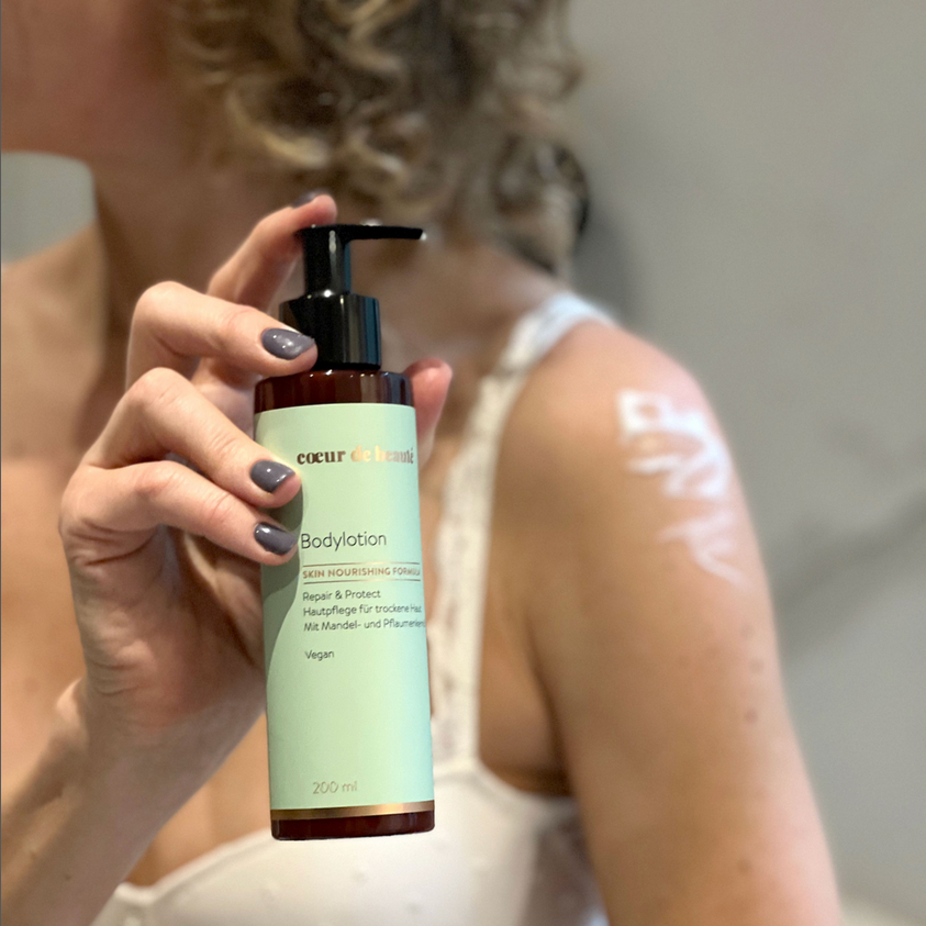 Die reichhaltige Bodylotion schützt Deine Haut mit einer wertvollen Mischung aus Sheabutter, Mandelöl, Pflaumenkernöl und Jojobaöl. Deine Haut beruhigt sich und die Hautschutzbarriere baut sich auf.