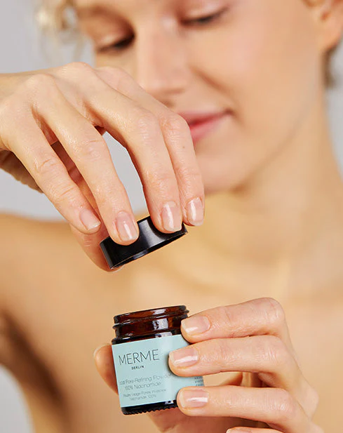 Um in deine Haut eindringen zu können, muss das MERME Pore-Refining Powder mit einem Facial Mist, sauberem Wasser oder einer Pflege auf Wasserbasis (wie dem Facial Hydration Serum) vollständig aufgelöst werden. Verdünne einen Dosierlöffel mit 3 Sprühstößen Facial Mist oder 10 Tropfen Wasser in deiner Handfläche und mische es, bis es sich komplett aufgelöst hat. Mische es nicht mit einem Öl, da es sich dann nicht richtig auflöst. In den ersten 1-2 Wochen kann ein kribbelndes Gefühl auftreten. Wir empfehlen, das Pulver zuerst auf einer kleinen Stelle zu testen. Mixe es nicht mit Vitamin C oder Formulierungen mit einem pH-Wert von 5 oder niedriger. Kontakt mit Augen oder Wunden vermeiden. Unterbreche die Anwendung, wenn Irritationen auftreten. Bei Zimmertemperatur lagern, Feuchtigkeit vermeiden und gut geschlossen halten. Geeignet für alle Hauttypen.