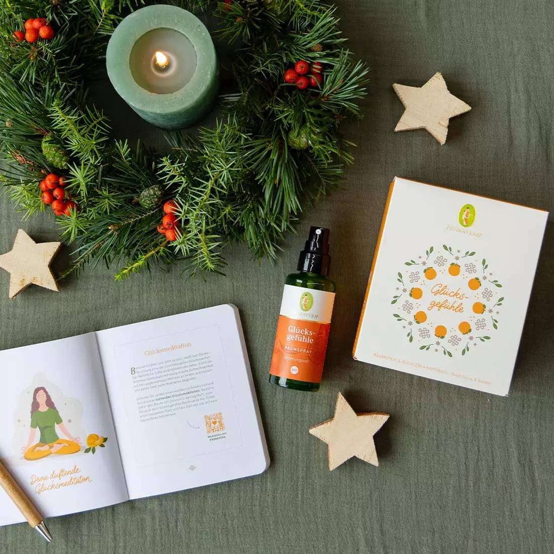Glücksgefühle - Geschenkset mit stimmungshebendem Raumspray und einem Notizbüchlein zum Sammeln von Glücksmomenten