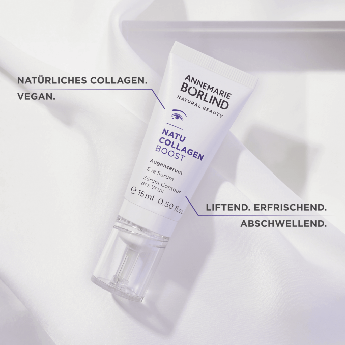 Die reichhaltige Pflege mit natürlich gewonnenem, veganem Kollagen, ist besonders nährend und feuchtigkeitsspendend. Ein Booster aus weißer Lupine regt die hauteigene Kollagenproduktion an und glättet Knitterfältchen, während die Hautdichte gesteigert und das Stützgewebe der Haut gestärkt wird.