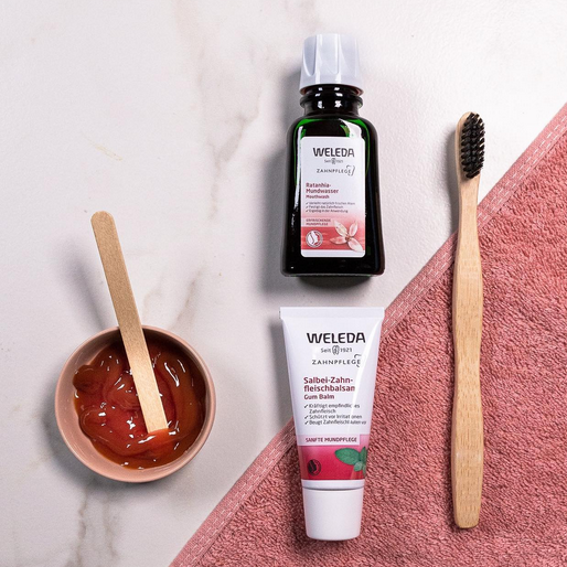 Das Weleda Ratanhia Mundwasser regt durch ätherische Öle und mineralische Substanzen die natürlichen Funktionen der Mundschleimhaut sowie der Mundflora an und sorgt für frischen Atem ohne Geschmacksbeeinträchtigung. Auszüge aus der peruanischen Ratanhiapflanze und Myrrhe kräftigen das Zahnfleisch und die Mundschleimhaut und helfen so, Entzündungen und Zahnfleischbluten vorzubeugen.