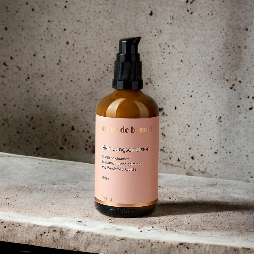 Deine Haut wird mit unserer sanften Reinigungsemulsion mit Mandelöl & Quitte zuverlässig von den Spuren, die der Alltag hinterlassen hat, befreit.
