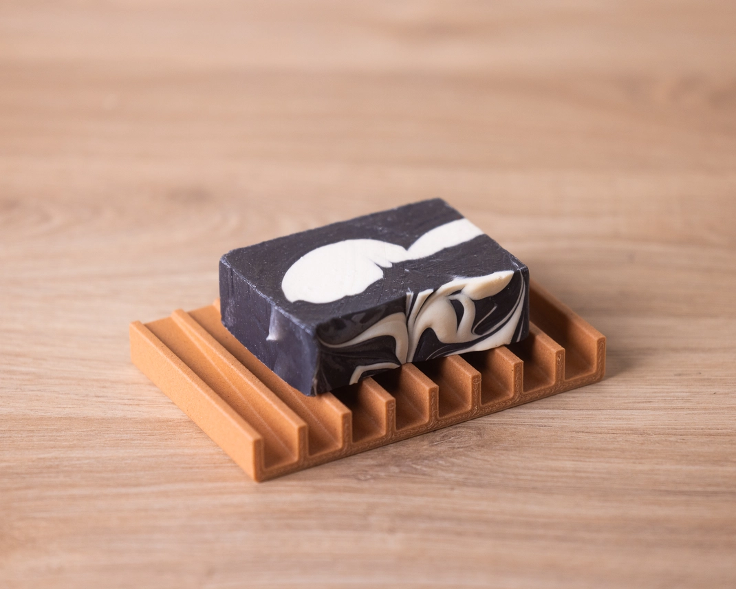 Die Seifenschale ist umweltfreundlich, da sie im 3D-Druckverfahren aus recyceltem Holz und Maisstärke hergestellt wird. Um sie zu reinigen, genügt es, sie mit Wasser abzubürsten.