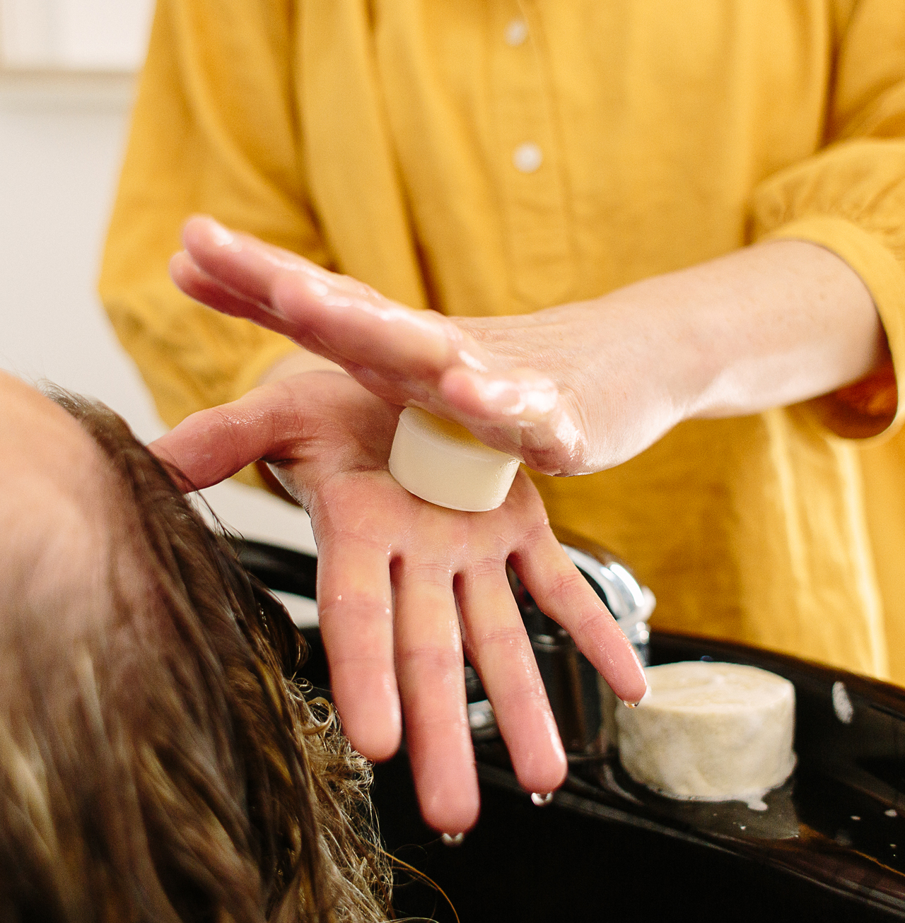Den MOISTURIZING BAR kurz unter dem Wasserhahn befeuchten und mit Druck zwischen den Handflächen reiben bis sich ein weißlicher Film davon ablöst. Den MOISTURIZING BAR auf einer Seifenschale/einem Luffaschwamm ablegen und beginnend an den trockenen Haarenden das Produkt gleichmässig in das handtuchtrockene Haar einarbeiten. Es wird sofort spürbar geschmeidiger und lässt sich hervorragend kämmen. Wie gewohnt föhnen oder lufttrocknen, ein Ausspülen ist nicht nötig.